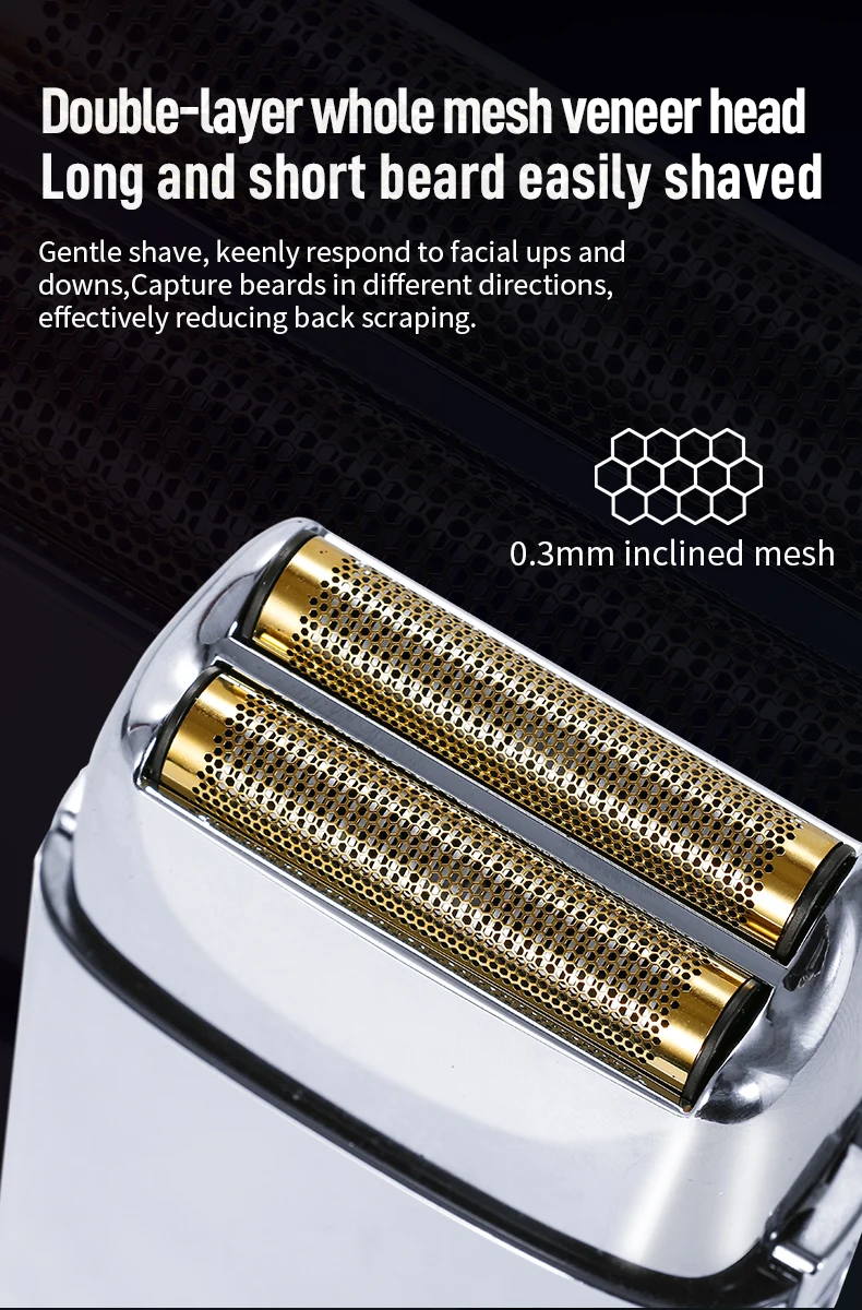🪒 Afeitadora eléctrica profesional recargable con motor potente y silencioso, lámina hipoalergénica de titanio dorado y sistema de doble cuchilla. Hasta 120 min de uso, carga USB en 2 horas. Uso con o sin cable. Ideal para un afeitado al ras, sin irritación. 🔋✨